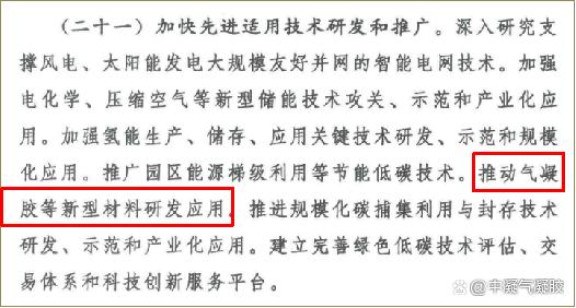 2021年9月22日,《中共中央 國務(wù)院關(guān)于完整準確全面貫徹新發(fā)展理念做好碳達峰碳中和工作的意見》(中發(fā)〔2021〕36號文)正式發(fā)布,為做好碳達峰、碳中和工作提出了指導(dǎo)性意見,“加快先進適用技術(shù)研發(fā)和推廣,推動氣凝膠等新型材料研發(fā)應(yīng)用”。